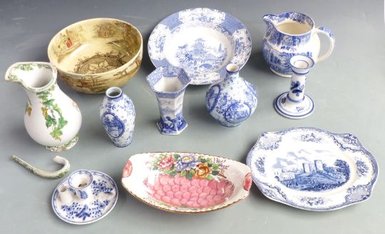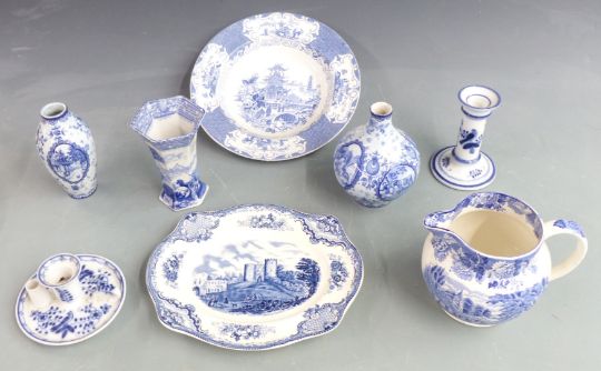 Royal Doulton Series Ware pedestal bowl, Maling dish, blue and white ceramics, German chamberstick and candlestick
