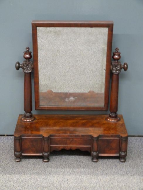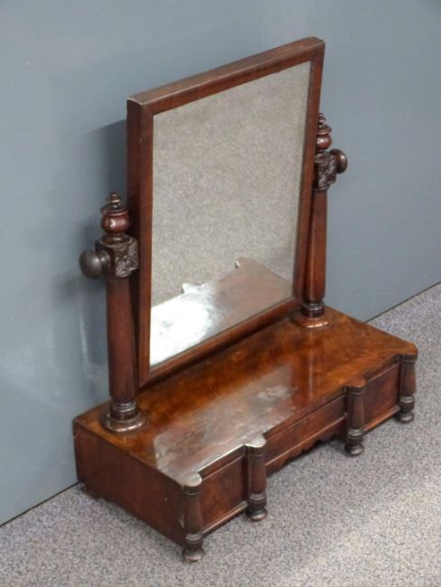 Georgian flame mahogany swing framed mirror with three drawers below, H68cm