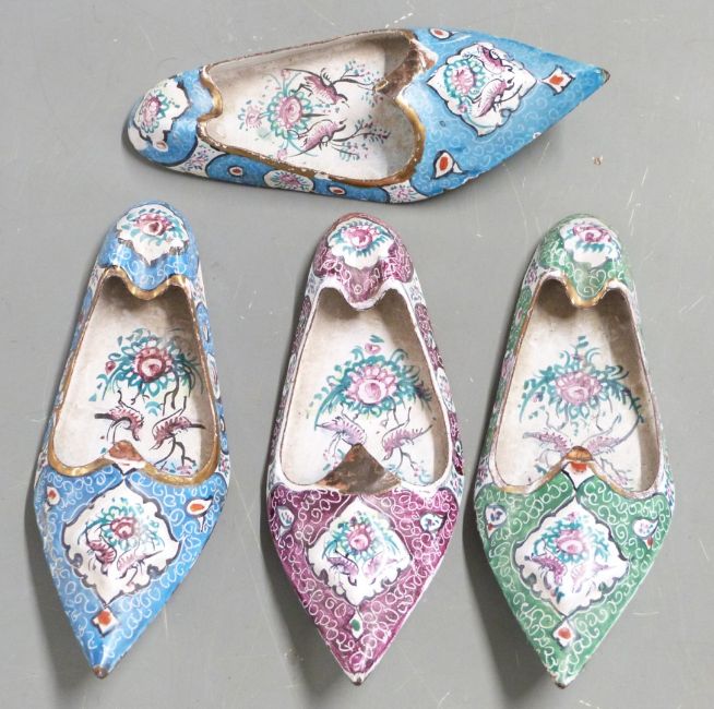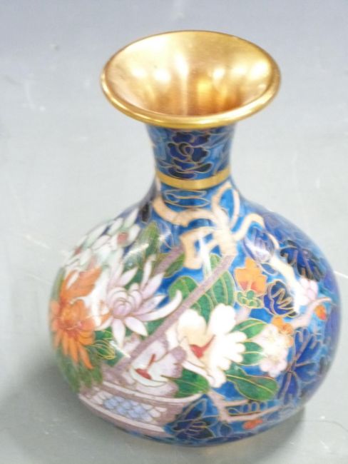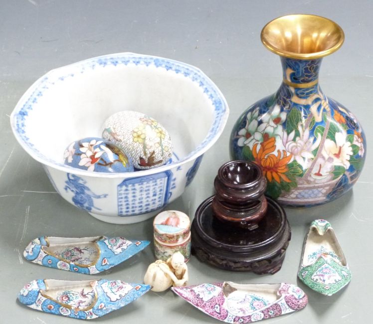 Cloisonné pedestal vase and eggs, enamel shoes, blue and white bowl etc, tallest 18cm
