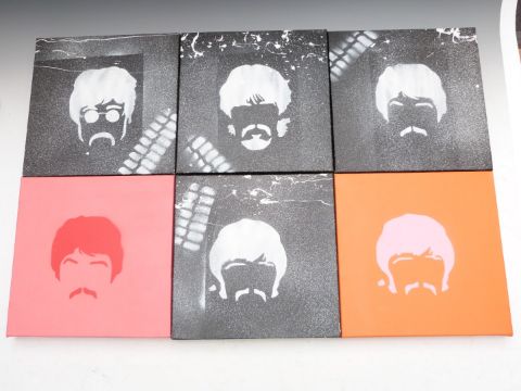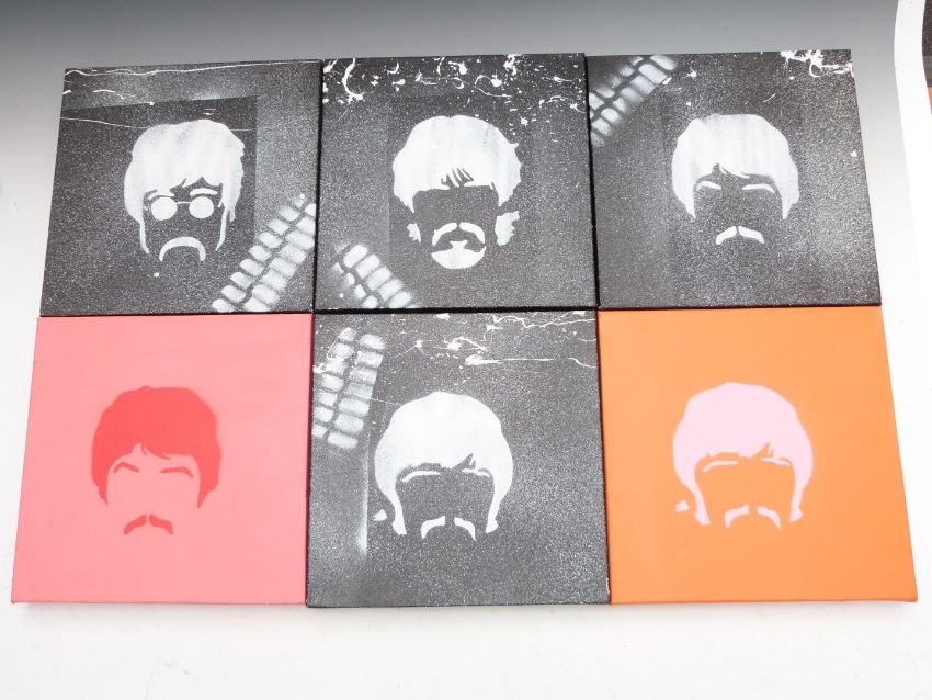 Beatles interest acrylic on canvas, 50 x 50cm and six smaller examples