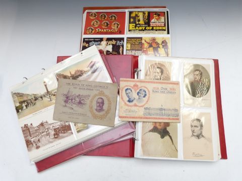 Three albums of postcards, mainly reprints including military and naval interest, film and wide range of topics and two small booklets of cigarette cards