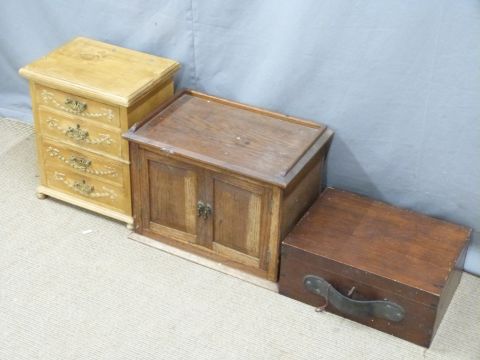 An oak cabinet, wooden box with leather handle and key and an apprentice style chest of drawers, largest W47 x D30 x H35cm