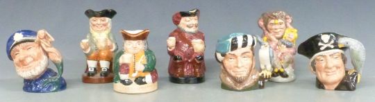A collection of Royal Doulton small character and Toby jugs including Jester, Winston Churchill, two The Guardsman etc, tallest 13cm