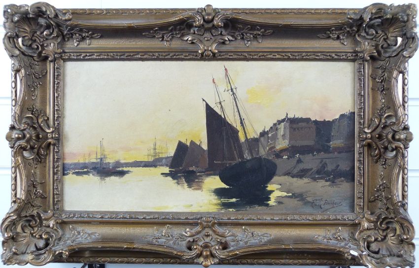 Ferdinand Bonheur (French 1817-1887) oil on canvas of sailing boats in an estuary, one beached, 20 x 39.5cm