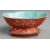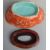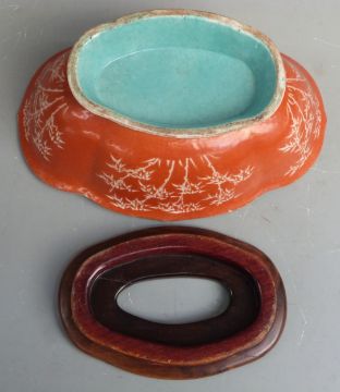 19thC Chinese porcelain dish with white floral decoration on burnt orange ground and turquoise interior and base, on rosewood stand, 26.5 x 18 x 12.5cm