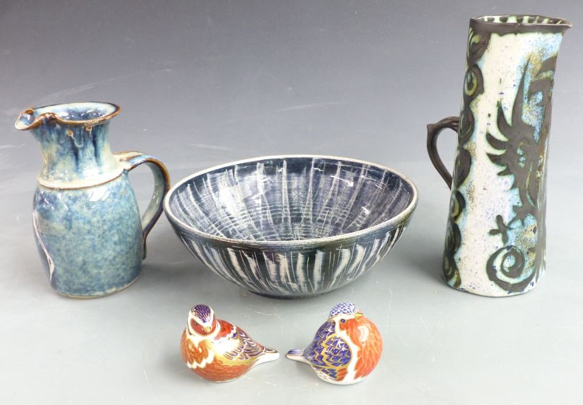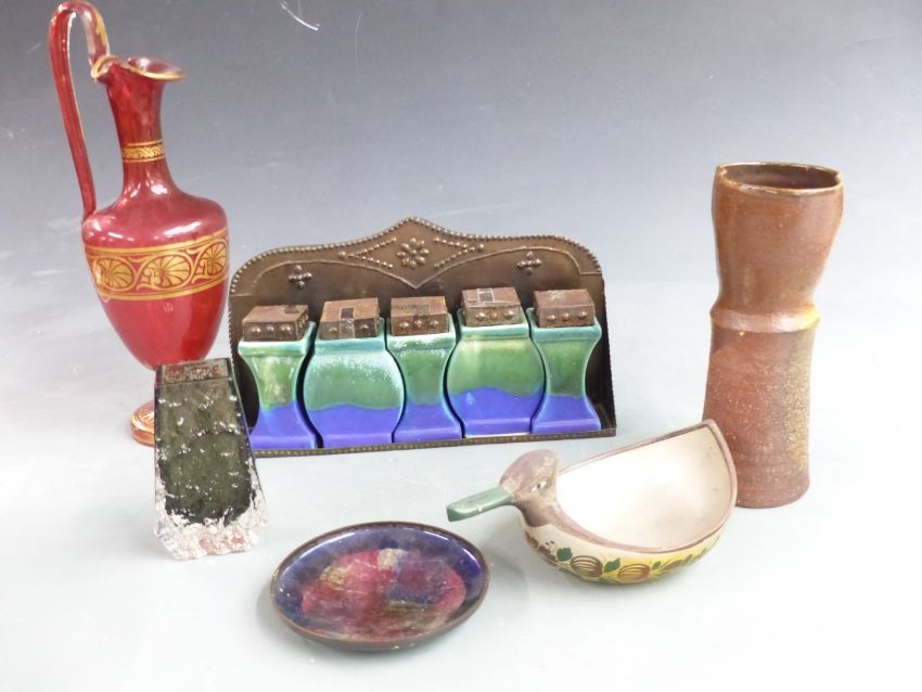 A collection of ceramics including studio pottery, Copenhagen/ Bing and Grondahl Christmas plates c1980s, Royal Crown Derby paperweights, pottery spice jars on stand, Whitefriars glass coffin vase and Victorian cranberry glass ewer, tallest 36cm