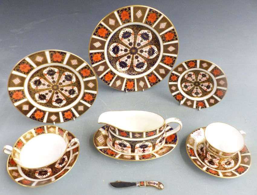 Royal Crown Derby Imari 1128 pattern eight place setting dinner and tea service including two covered tureens, eight soup cups, eight cups, eight 14.5cm saucers, eight 16cm saucers, eight 16cm side plates, eight 21.5cm intermediate plates, eight 26.5cm dinner plates, gravy boat and underplate, approximately 62 pieces