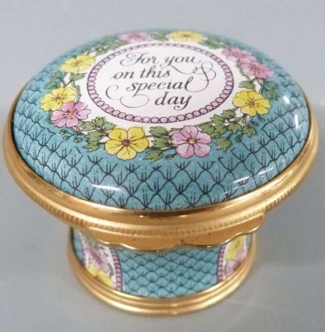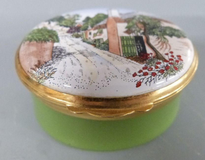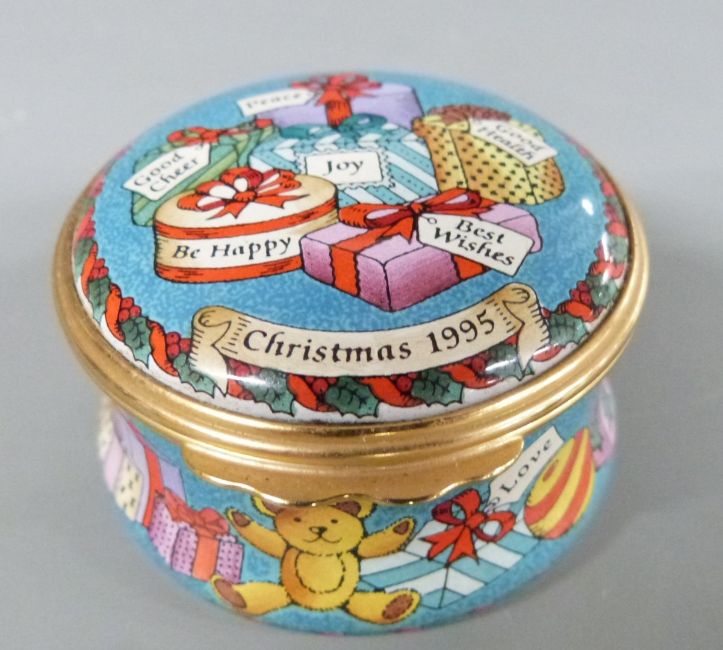 Seven Halcyon Days enamel boxes including Bermuda Heritage Series, Christmas 1995, Mother's Day 1982 etc