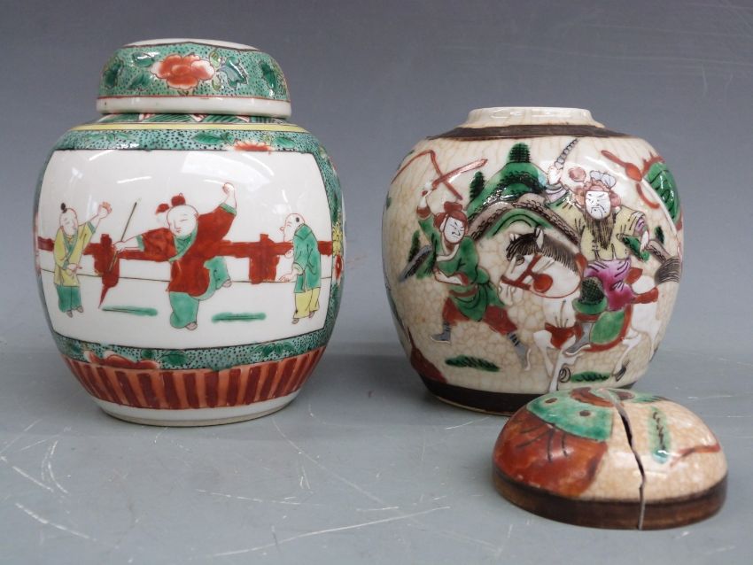 Two 19th/20th Chinese famille verte ginger jars, one with mark to base, largest H15cm