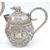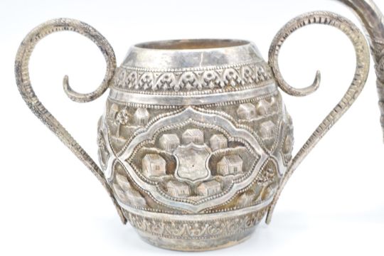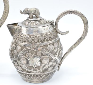 Indian or Burmese white metal bachelor's tea set with elephant finials and embossed decoration of villages made up of huts, given to the vendor's grandfather John William Tomlinson in recognition of his achievement setting up a cotton mill, height of teapot 13cm, weight 616g
