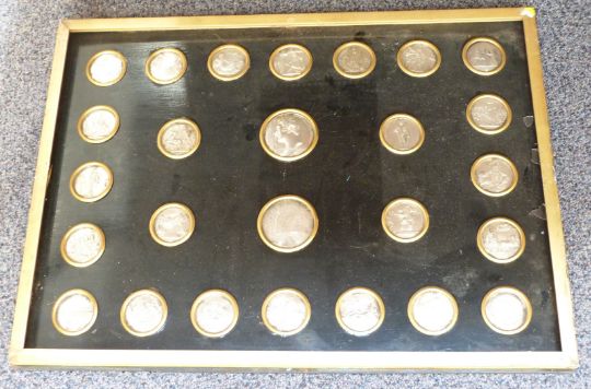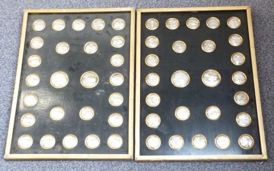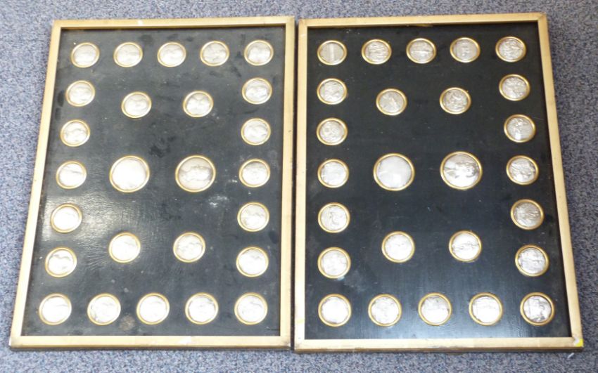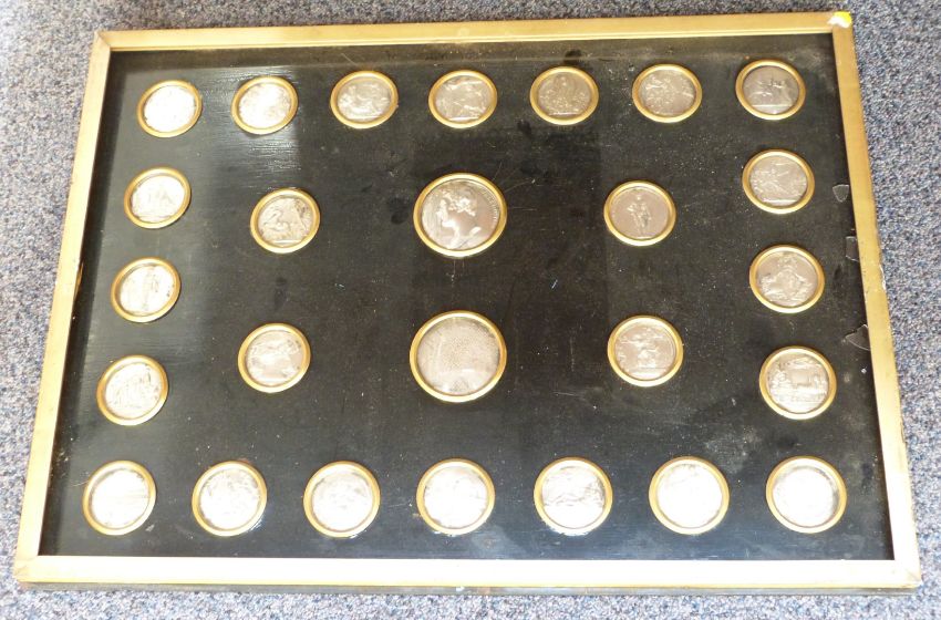 Two framed sets of twenty six Victorian pressed white metal medals and medallions with the Duke of Wellington central, and other medals commemorating military battles and events, some designed by P Rouw, ex Douglas - Cooper family, largest diameter 5.5cm, each frame 39 x 53cm