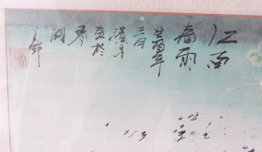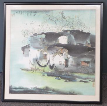 Japanese watercolour landscape with boats beside a house, 66 x 67cm