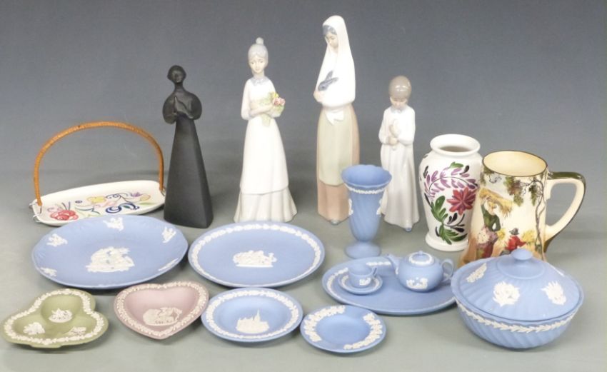 Royal Doulton and Nao figures, Gleaners mug, Wedgwood Jasperware etc, tallest 27cm