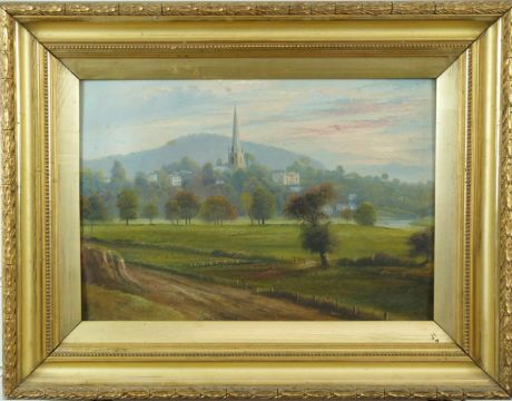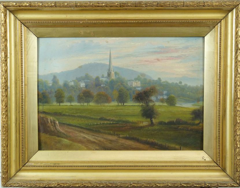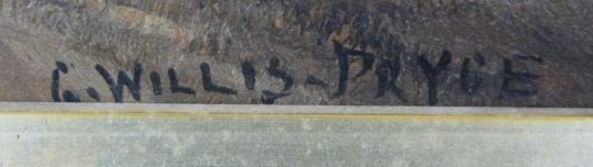 G Willis Pryce oil on board church in pastoral setting with hills beyond, signed to lower edge, 26 x 38cm, in gilt frame