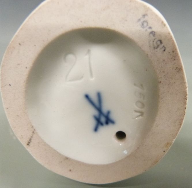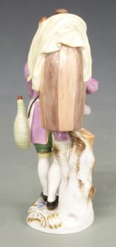Meissen figure of a water carrier, blue crossed swords mark and impressed numbers 21 and 150 to base, H15cm