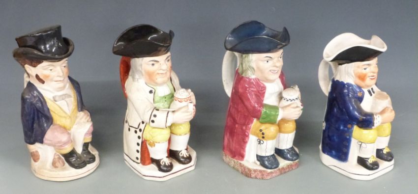 Four 19thC Toby jugs including one with top hat, sponge decorated etc, tallest 26cm