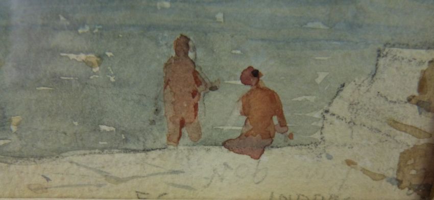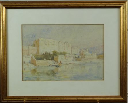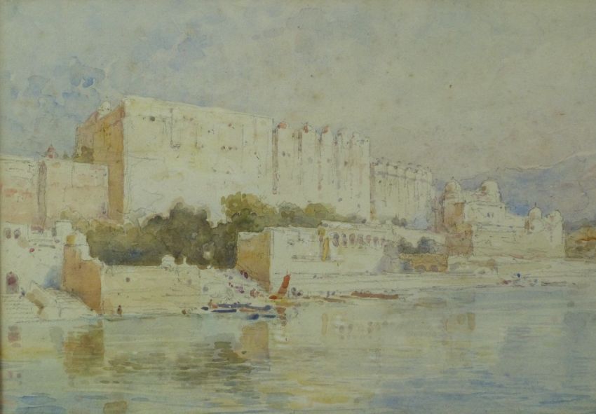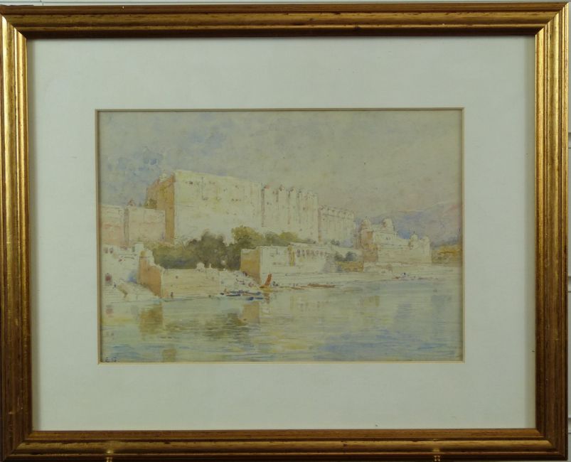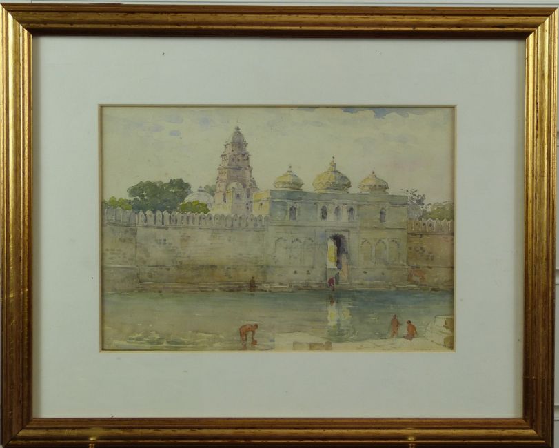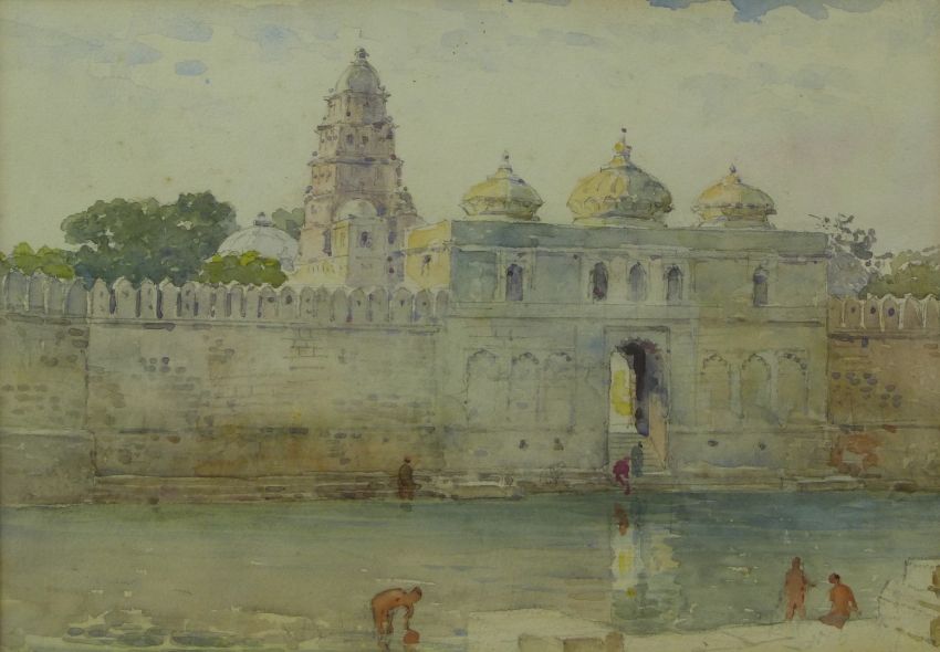 Three watercolours comprising riverside temple, another similar river scene initialled EG and garden scene, indistinctly signed lower left, largest 21 x 26cm