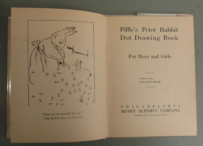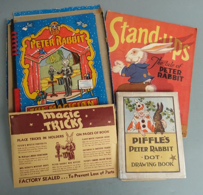 [Potter] Peter Rabbit The Magician, A Book of Tricks 1942 with Wand and envelope containing a collection of props for performing various tricks including Magic Pocketbook, Mystic Portraits, Phantom Cards etc, housed in original card box, The Tale of Peter Rabbit with Stand-ups by Sidney Sage 1934 with lift-up figures for creating 3d stand-up models, Peter Rabbit Dot Drawing Book 1920 in original dust-wrapper (3)