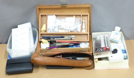Artist's materials including Winsor and Newton artist's box, brushes and accessories