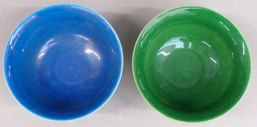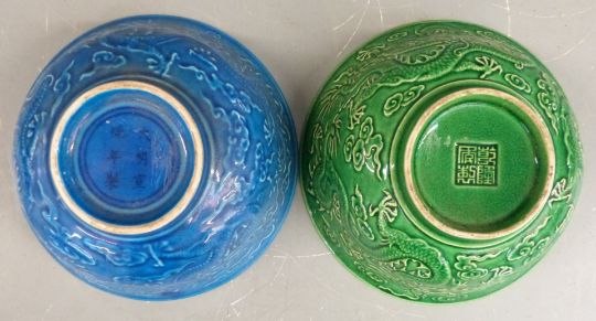 Two Chinese crackle glaze bowls with dragon decoration, one green and one blue, both with mark to the bases, 16cm in diameter.