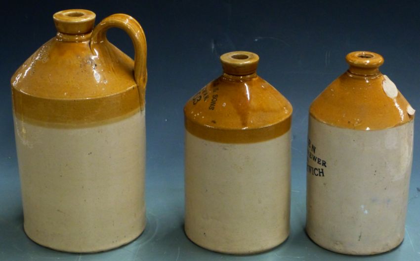 Three stoneware flagons for Wintle Bros Dursley, John Arnold Wickwar and P A Green West Bromwich, tallest 33cm