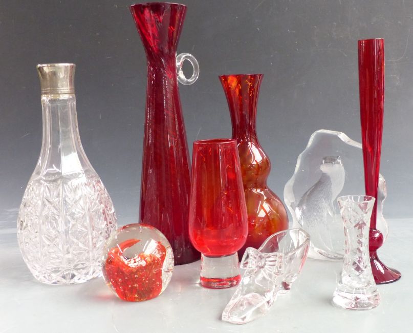 Three matching studio pottery vases with impressed decoration and indistinct mark to the bases together with a ruby glass water jug and matching vase, a twin handled vase, a pressed glass tazza and silver plate collared decanter, Staffordshire toby jugs, Mason's Mandalay jugs etc