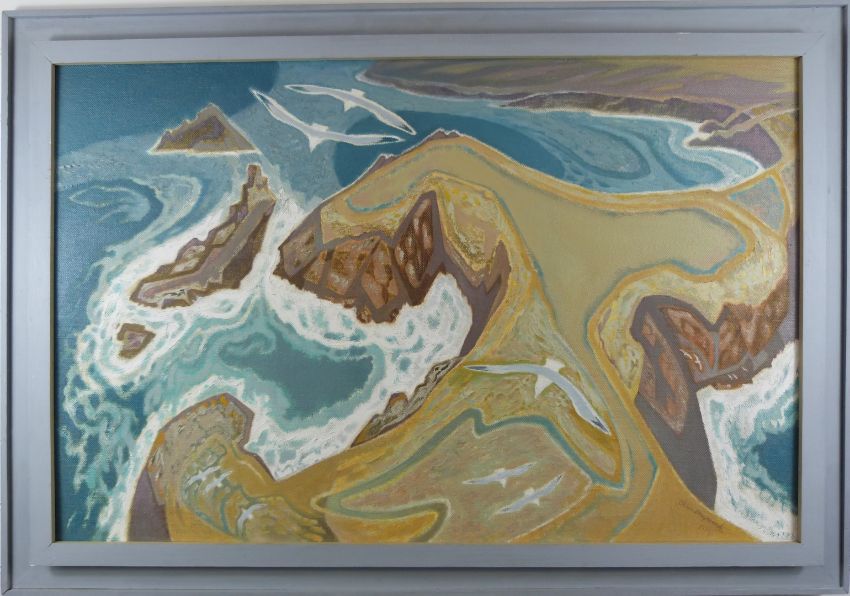 Oliver Heywood (1920-1992) large oil on canvas abstract coastal scene The Rumps, Pentire, North Cornwall, signed and dated 1970 lower right, 70 x 108cm