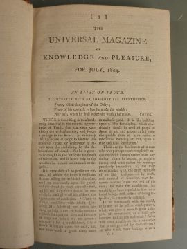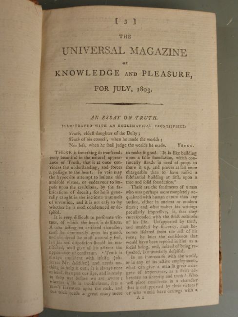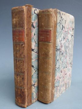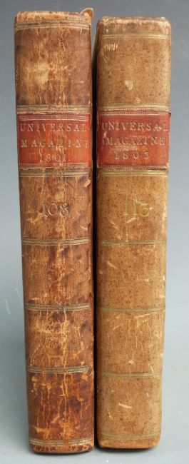 The Universal Magazine of Knowledge and Pleasure: containing Original Essays on Various Subjects of General Literature and the Times, Interesting Communications on the Several Branches of the Arts and Sciences etc Volume CVIII printed 1801 first edition complete with 12 plates (3 hand-coloured) with Volume CXIII printed 1803 first edition complete with 11 plates (1 folding) bound in leather backed marbled boards and gilt leather title labels (2)