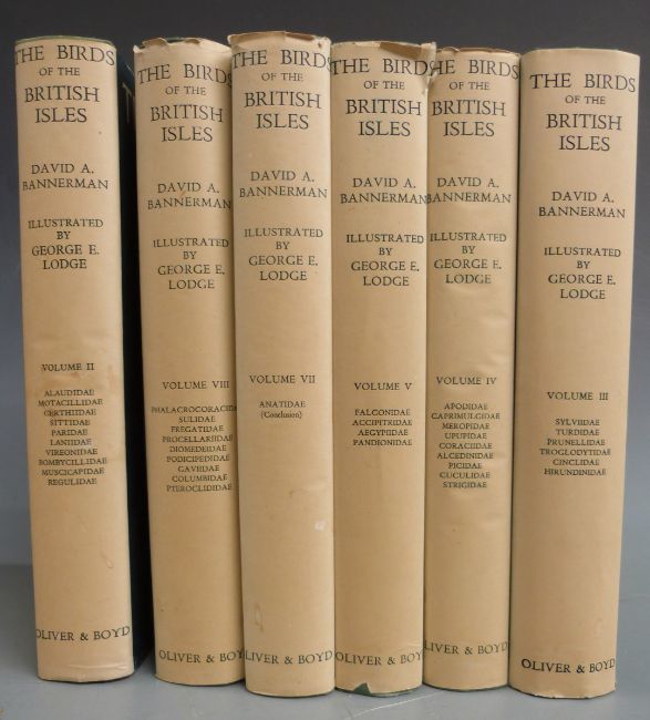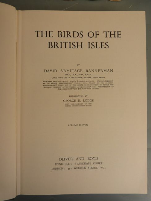 [Signed] The Birds of The British Isles by David Armitage Bannerman and illustrated by George E. Lodge, published Oliver & Boyd 1953-1963 in 12 volumes with coloured plates in gilt lettered cloth and colour dust-wrappers, signed by auther in first volume