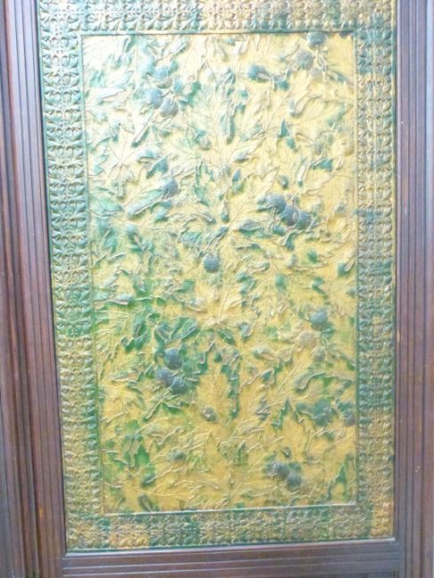 Victorian mahogany screen/three fold room divider with embossed panels decorated with oak leaves and acorns and substantial integral brass hinges to each section, W219 x H196cm