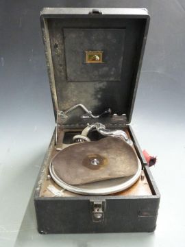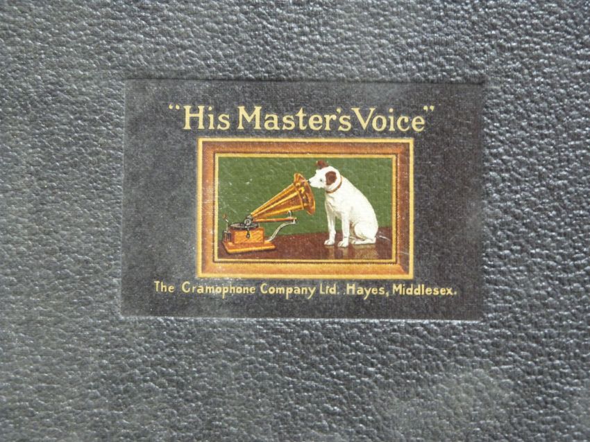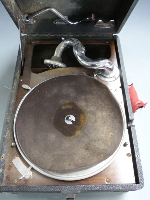His Master's Voice c1930s portable wind up gramophone in black Rexine finish