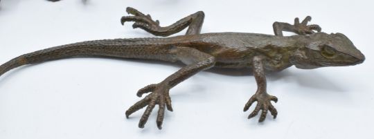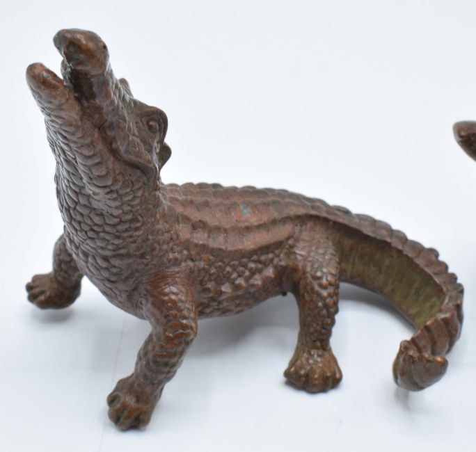 Four Japanese bronzes, a lizard, lobster, crocodile and pangolin, three marked to base, largest 10 x 3.5cm