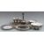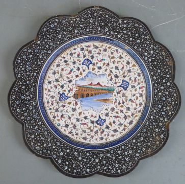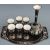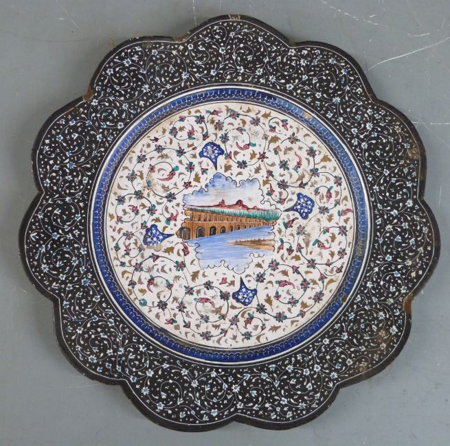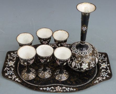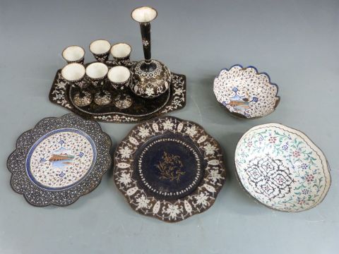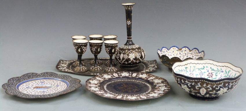 Four pieces of 19th/20thC Persian enamelled ware including two pedestal bowls, largest H7.5cm, diameter 19cm and a wine set on tray with jewelled decoration, H21.5cm