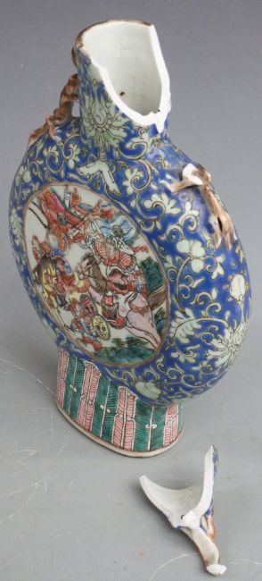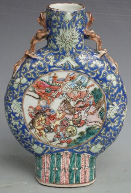 A 19thC Chinese moon flask with figural decoration and dragon handles, H 24cm