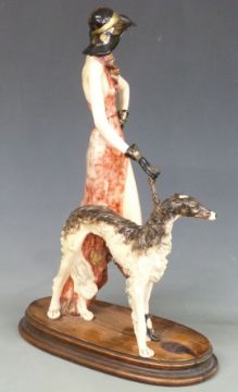 Santini Art Deco style figurine with dog on wooden base, H44cm