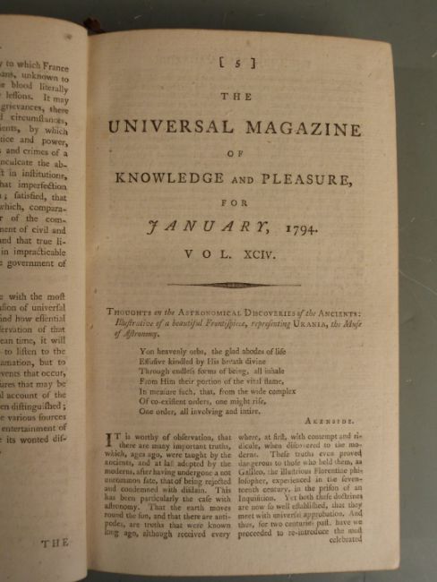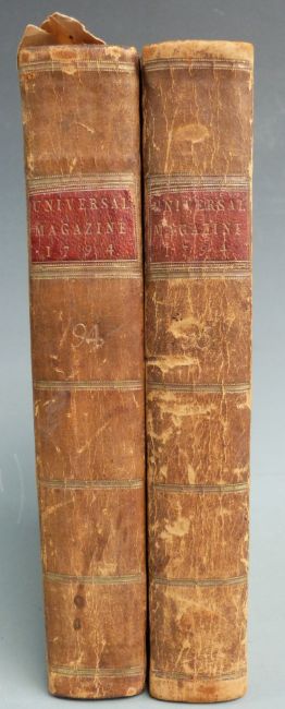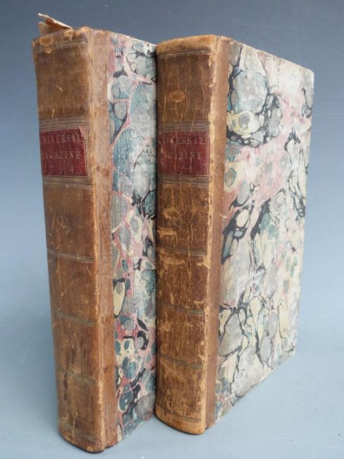 The Universal Magazine of Knowledge and Pleasure with Essays, Literature, Arts and Sciences etc volume XCIV printed 1794 first edition complete with 15 plates (including 3 folding maps and folding view of Chime Machine) and volume XCV printed 1794 first edition complete with 13 plates (including three folding maps and plan of Theatre Royal) bound in leather backed marbled boards with gilt lettered leather labels (2)
