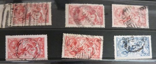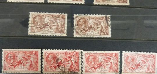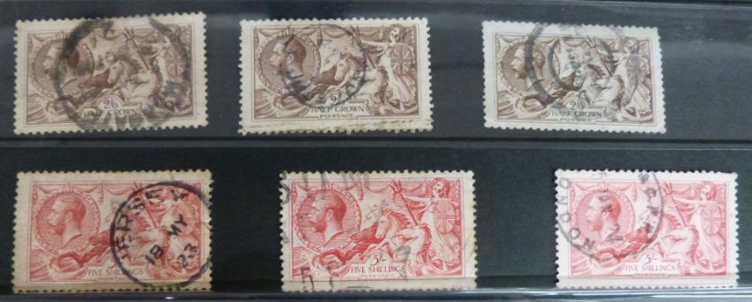A sheet of seahorse stamps 1913-18, 2s 6d-10s (19) and a sheet of seahorse stamps 1934, 2s 6d and 5s (9)