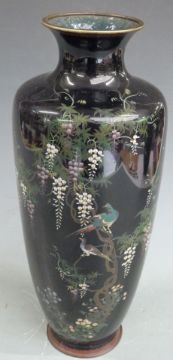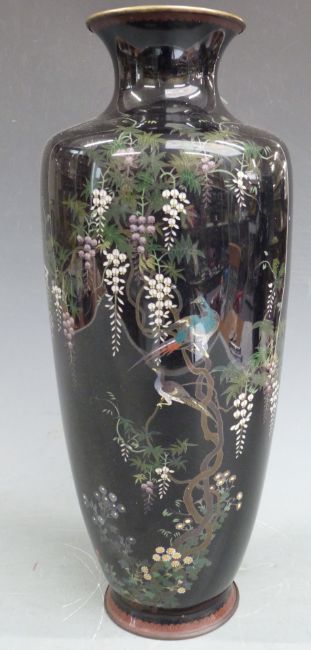 A late 19th/20thC Chinese cloisonné pedestal vase decorated with birds perched in wisteria, H37cm