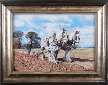 Don Styler British (20th/ 21stC) oil on board over photograph ploughing with two grey heavy/ shire horses, script verso 'This England 1942' signed 28 x 39cm