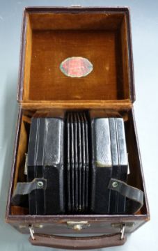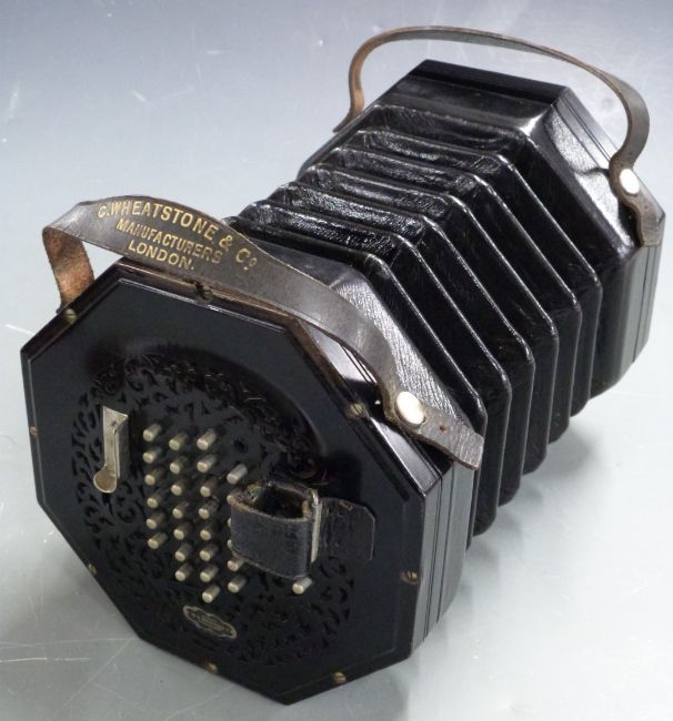 Charles Wheatstone Aeola 56-key English concertina with ebony ends, six fold Moroccan leather bellows and steel reeds, in original leather case. Instrument no 34367, year of manufacture 1936, with original receipts and price list