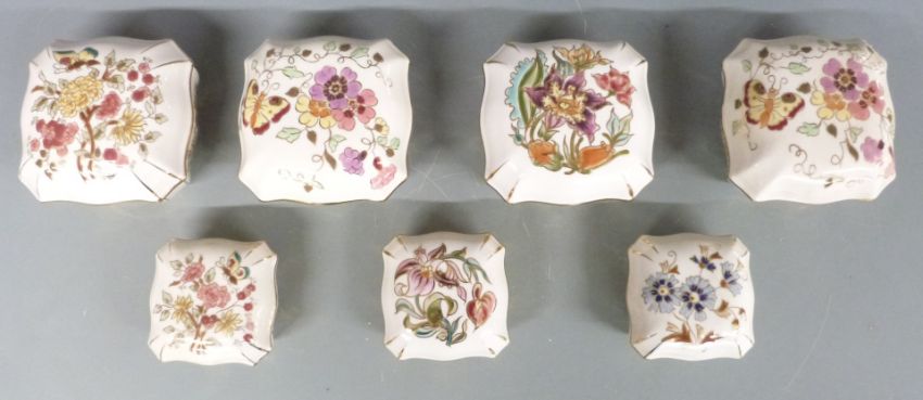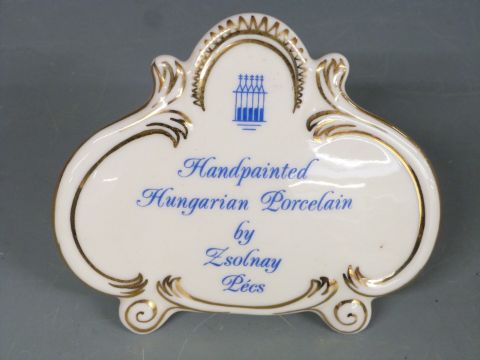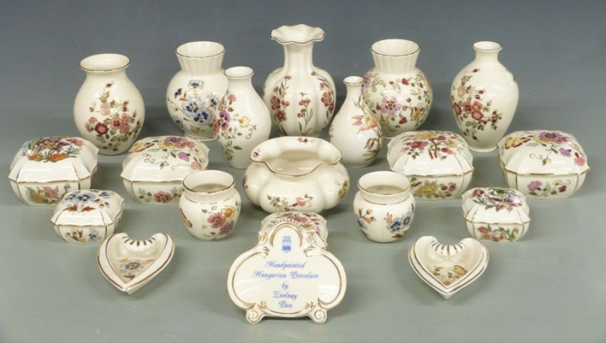 A collection of Zsolnay Pecs porcelain including trinket boxes, dishes, Zsolnay advertising sign, vases etc, tallest 14cm