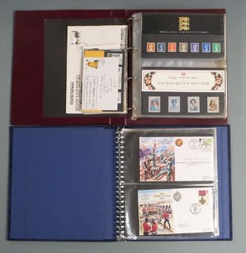 An album of GB presentation packs, Benham military related signed covers and three stockbooks