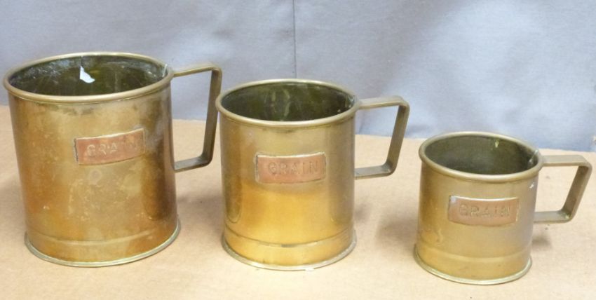 Arts and Crafts style copper jug with riveted handle, graduated set of three brass grain measures, height of tallest 11cm, Ever Ready hand lamp and a novelty "Just a shot" measure formed as a shotgun cartridge