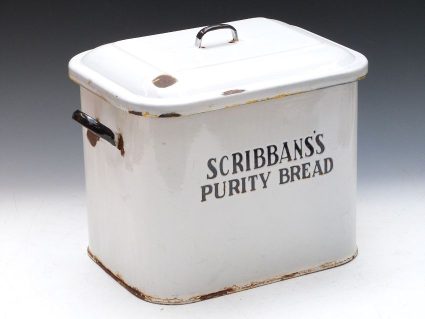Vintage enamel bread bin 'Scribbans's Purity Bread', width 40cm
