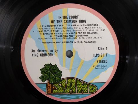 King Crimson - In The Court Of The Crimson King (ILPS 9175), Earthbound (HELP 6), Larks Tongues In Aspic (ILPS 9230), Starless and Bible Black (ILPS 9275) and Red (2302 066). All pink rim less Earthbound and Red, records appear Ex/VG with slight wear to covers