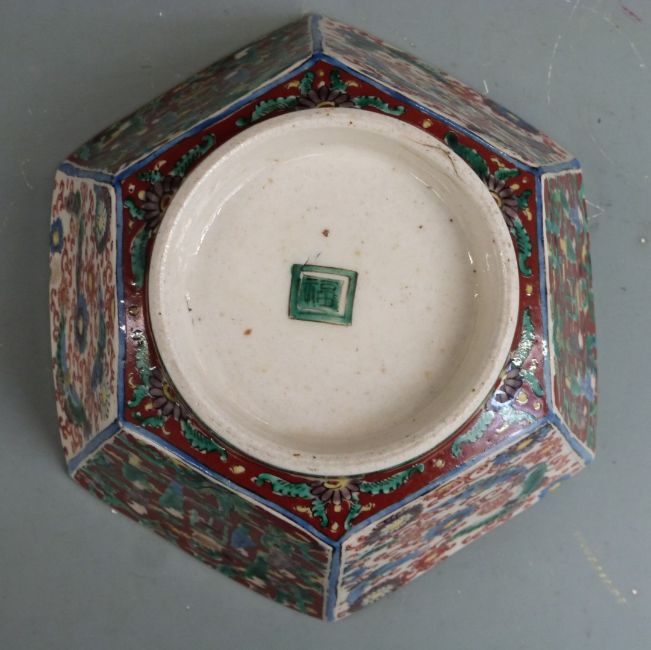 A late 18th/19thC Chinese octagonal pedestal bowl with enamelled figural and botanical decoration and seal mark to base, H9cm, diameter 20cm