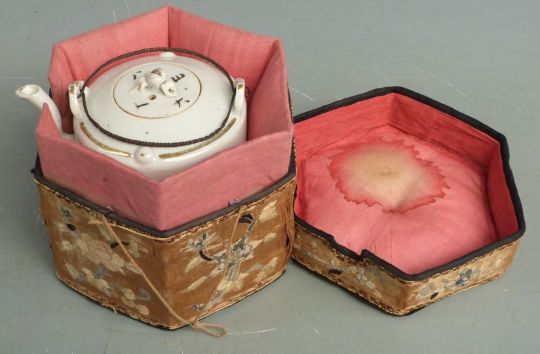 Chinese late 19thC/20thC teapot in ornate silk case with floral decoration, case 14 x 15 x 15cm