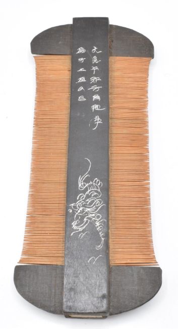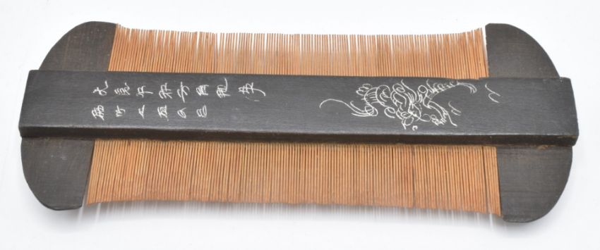 Japanese Meiji period double sided comb with bone centre, hardwood frame and decorated with a dragon and script, W12.8 x D5.5cm