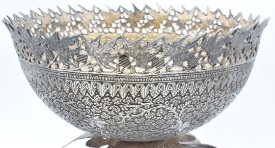 19thC Indian white metal Kashmiri/Srinagar pedestal centrepiece with embossed bowl raised on a foliate support, given to the vendor's grandfather John William Tomlinson in recognition of his achievement setting up a cotton mill, height 25cm, weight 1043g