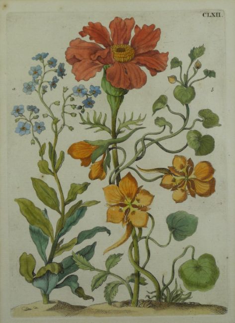 Two 18thC hand coloured engravings of flowers after drawings by Maria and Johanna Merian from 'Insects of Surinam' plate CLXII and CLXXXIV, label verso 'Original Kupferstich Maria Sybilla Merian 1905', 21 x 15cm